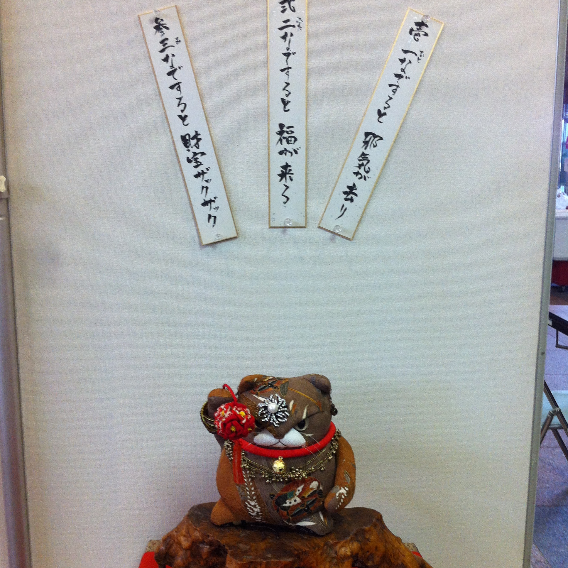 おりしも猫の日(にゃんにゃんにゃんの日)ということもあってか、生徒さん製作の猫ちゃんたちがいっぱい。なでるとご利益があるという猫さんをなでてきました。